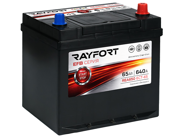 RAYFORT EFB REA650 — стартерный аккумулятор, изготовленный по технологии EFB (Enhanced Flooded Battery) ООО «Зубр Энерджи» в Республике Беларусь. Ёмкость 65Ah, пусковой ток 640A (EN), корпус D23 230×173×225 мм, масса не более 17 кг, обратной полярности. EFB — это улучшенный “залитый” свинцово-кислотный аккумулятор с повышенной устойчивостью к циклам и лучшим приёмом заряда по сравнению с обычными АКБ, рассчитанный на частые запуски и работу в городском режиме.